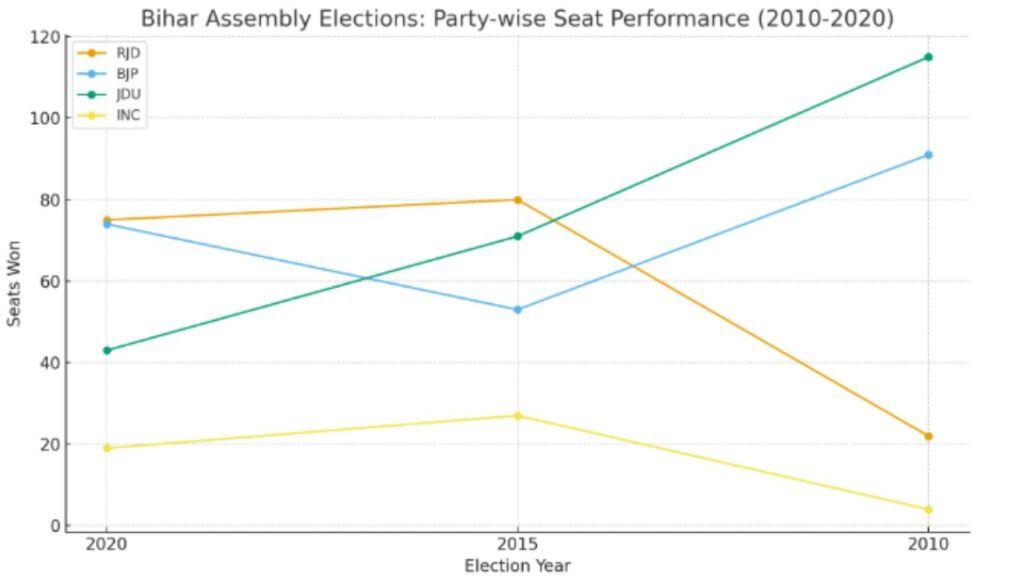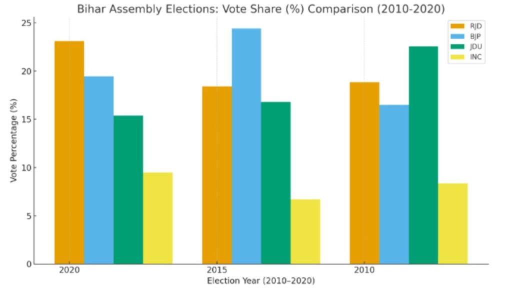 पिछला डेटा बताता है कि आरजेडी के पास एक मज़बूत वोट आधार (Core Vote) है, जबकि नीतीश कुमार सीटों के लिए गठबंधन के जादू पर निर्भर रहे हैं।