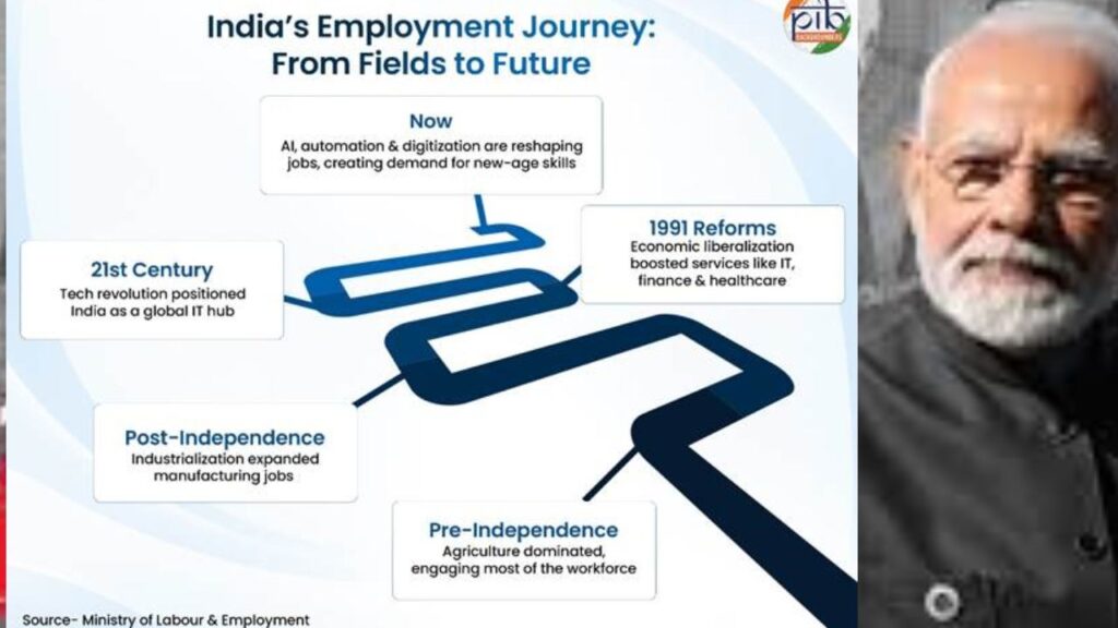 PM विकसित भारत रोज़गार योजना अगस्त 2025 में लॉन्च। लक्ष्य: 2027 तक प्रोत्साहन के माध्यम से 4.5 करोड़ से अधिक नौकरियाँ पैदा करना।