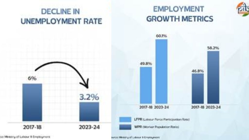 बेरोज़गारी दर में बड़ी गिरावट: बेरोज़गारी दर (Unemployment Rate – UR) 2017–18 के 6.0% से कम होकर 2023–24 में केवल 3.2% पर आ गई है।