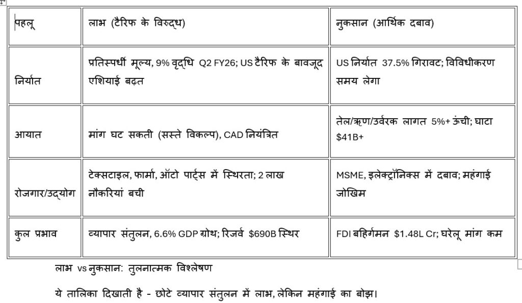 विविधीकरण तेज: जुलाई 2025 का इंडिया-UK FTA, UAE CEPA विस्तार। सरकार का ‘निर्यात प्रोत्साहन मिशन’ – MSME को क्रेडिट गारंटी, टैक्स कट। FDI $50 अरब आया, 2025 में $100 अरब लक्ष्य। कुल मिलाकर, गिरावट टैरिफ का जवाब – दर्दनाक लेकिन रणनीतिक।